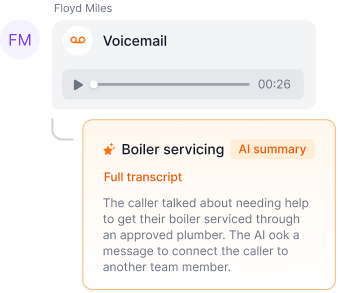 Our AI agent answers professionally, understands what they need, and texts you the details. You can respond by text immediately or call back with full context. No more useless voicemails saying 'call me back.'