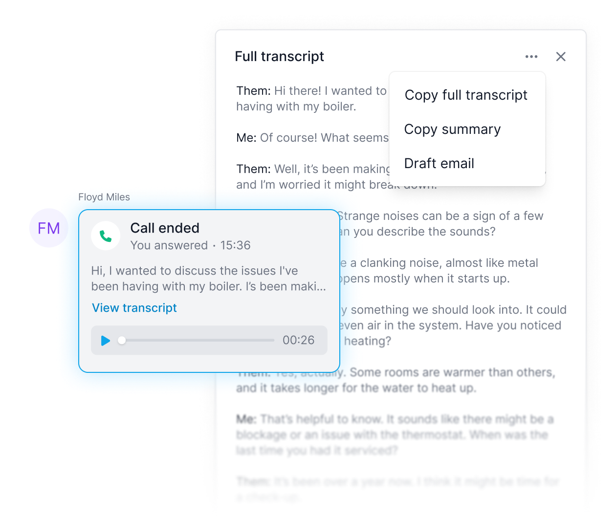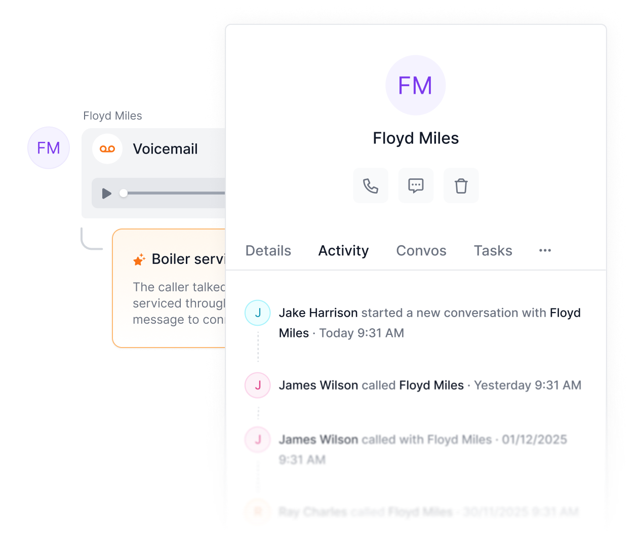 One inbox for calls, texts, and voicemails. Everyone knows who's handling which customer. No more "I didn't see that message" or customers explaining their issue three times.